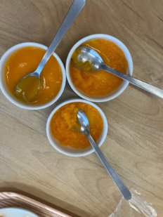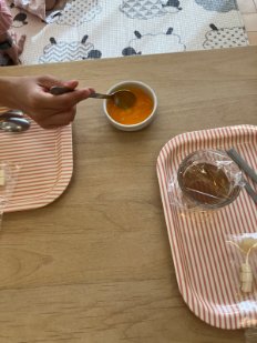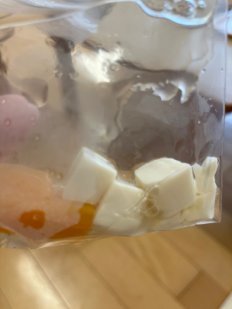 袋に入った豆腐、人参、カブをつぶしたり、舌を使って上顎に押しつけて食べる体験をしました。